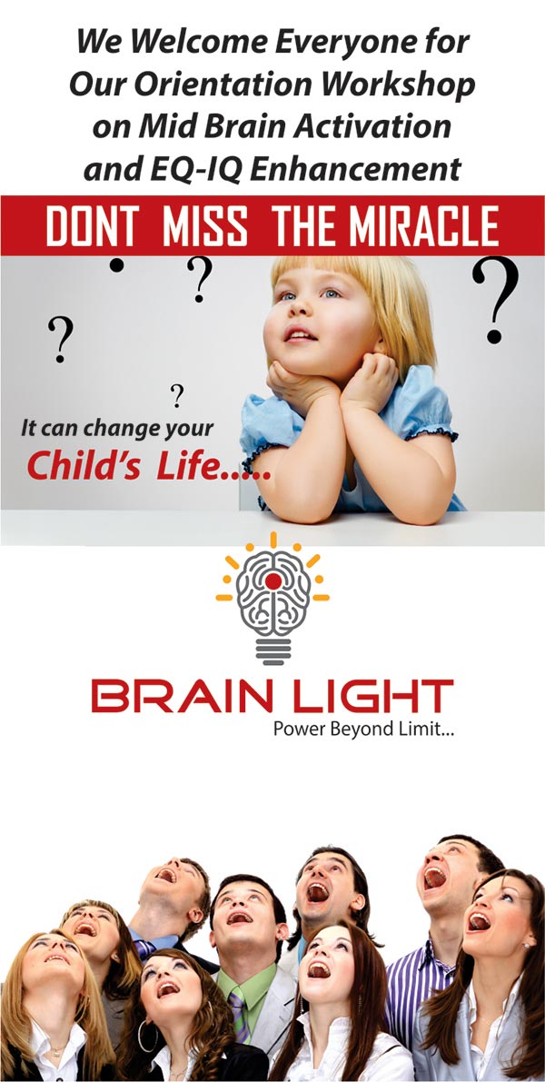 Brain Light organises Mid Brain Activation Course for childrens and adults through Scientifically Developed Natural Brain Wave Frequency Program which lights up a centric brain called penal gland. This program stimulates human brain through stress-free music and other relaxation techniques.